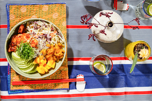 Dresseren: Vet een kommetje licht in met sesamolie. Schep de warme quinoa-bloemkoolrijst erin, druk aan en keer om op een bord zodat je een mooie ronde basis krijgt. Schik errond de koolsla, de in sneetjes gesneden kip, avocado, mango en wat waterkers. Serveer de sesamsaus ernaast.