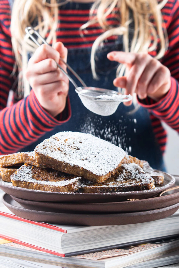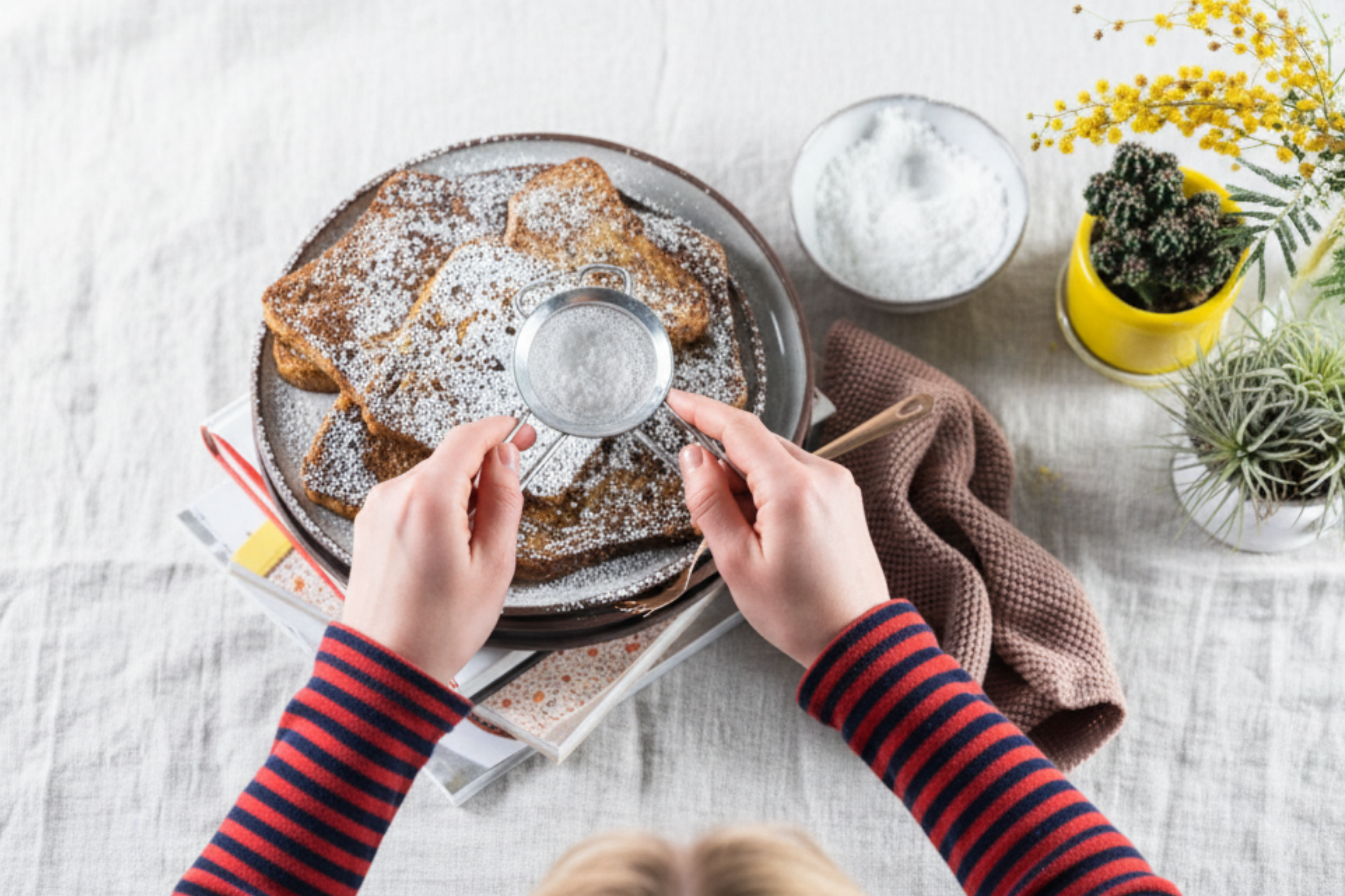 Leg de wentelteefjes op een bord en bestuif met poedersuiker. Serveer bij voorkeur met vers seizoensfruit of wat yoghurt, of puur zoals Sofie Dumont het het lekkerst vindt — met een kop koffie.