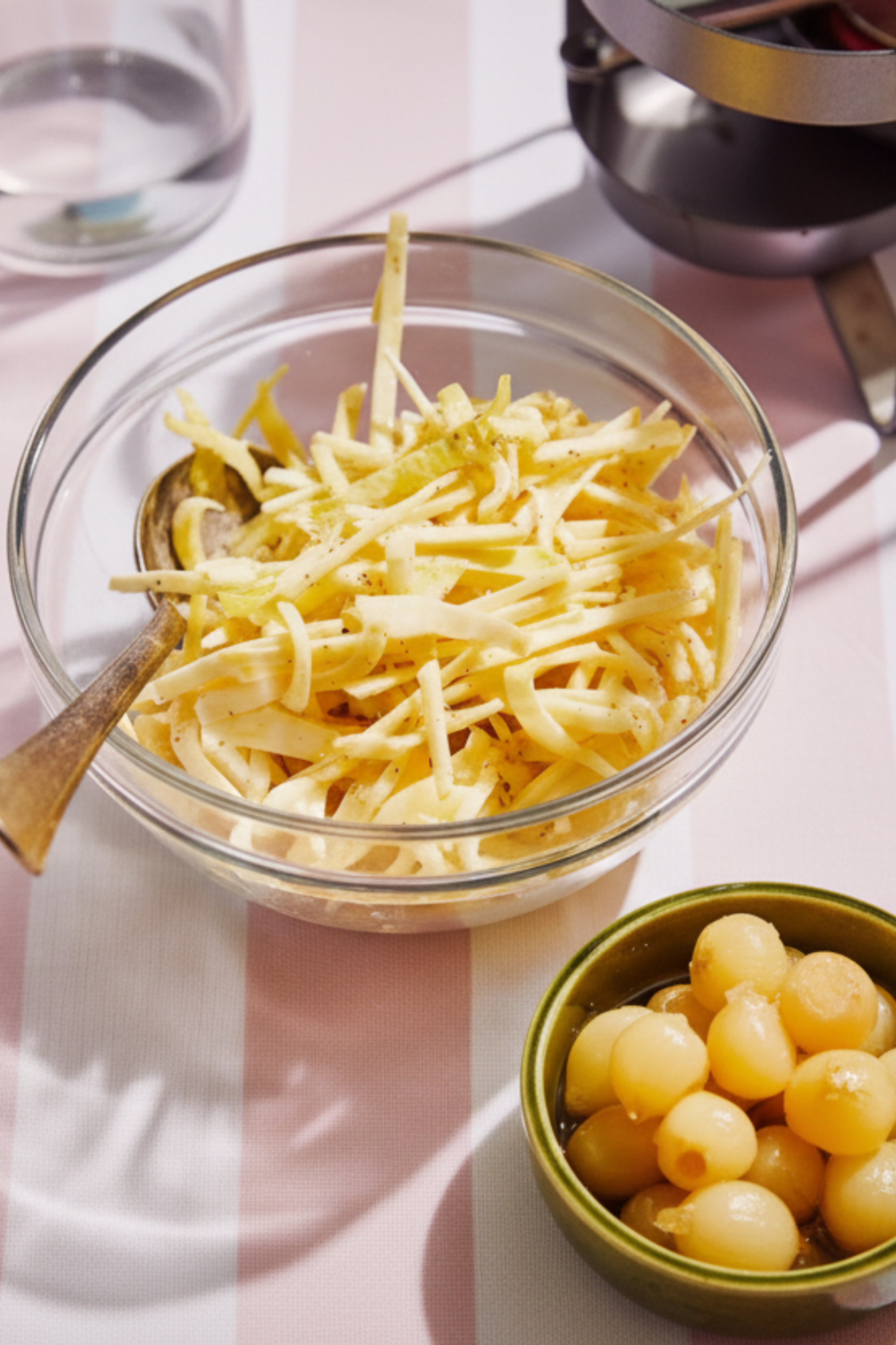 Schil de knolselder en snijd hem in fijne reepjes (julienne). Snijd het witloof in dunne reepjes zodat de bitterheid mooi samenvalt met de knolseldertextuur.