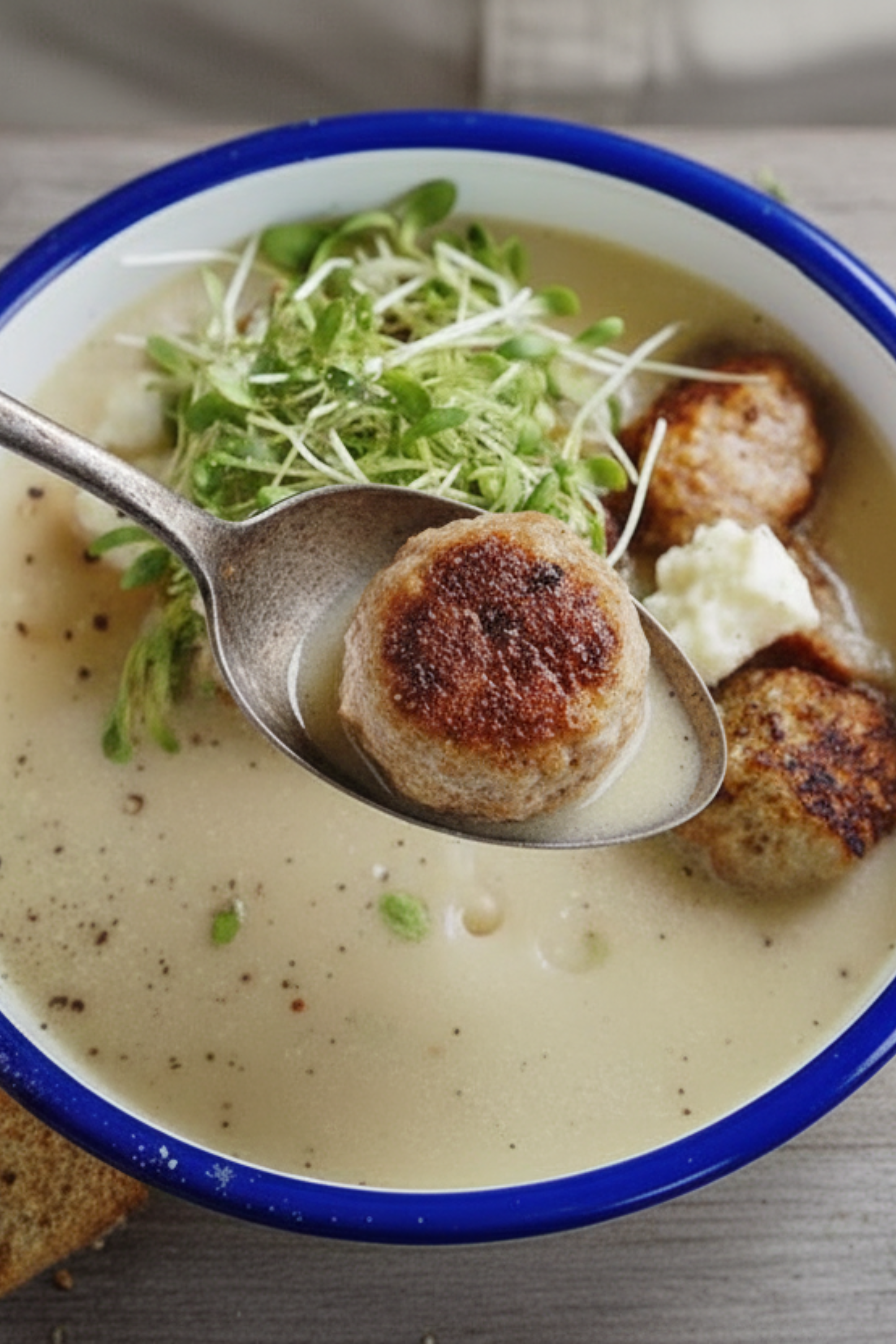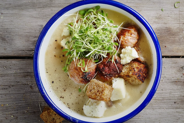 Schep de soep in kommen, werk af met de warme ballekes en strooi er de krokante croutons over. Serveer direct zodat de textuur van de croutons behouden blijft.