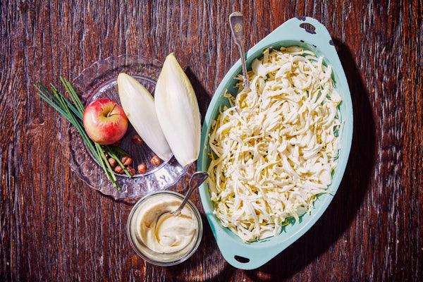 - Wil je de salade al klaarzetten? Snijd het witloof en spoel het, laat goed uitlekken. Meng de mayonaise en andere ingrediënten pas op het laatste moment erbij voor een frisse en knapperige salade.