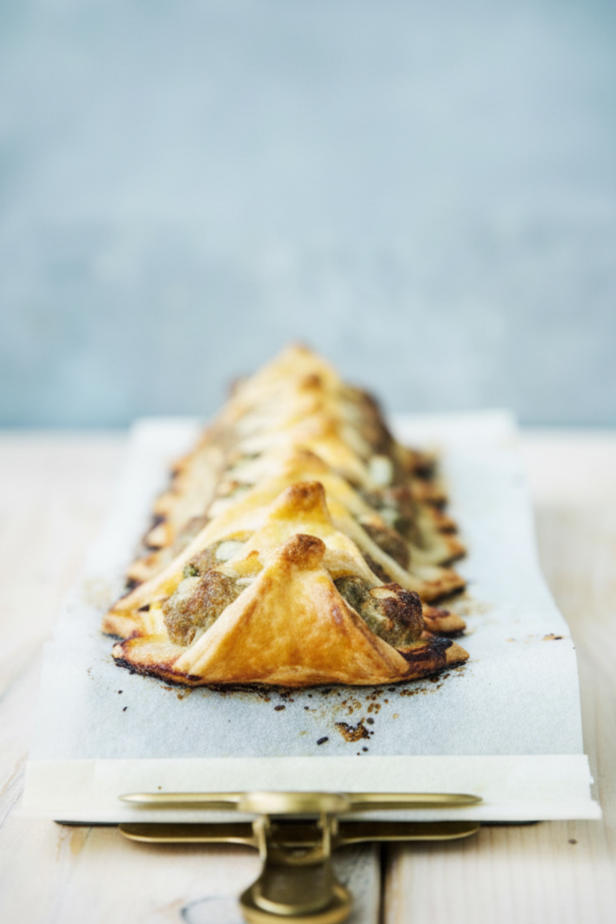 Snijd vierkantjes van 5 × 5 cm uit het deeg. Rol van het gehakt kleine worstjes van ongeveer 5 cm lang en leg deze schuin op de deegvierkantjes.