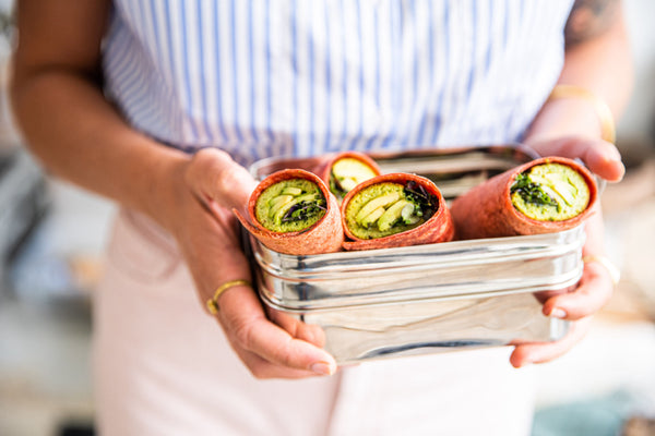 - De wrap rol je het makkelijkst strak op als je eerst de zijkanten naar binnen vouwt en dan van onder naar boven rolt. Zo valt alles mooi op zijn plek en loopt er niets uit.