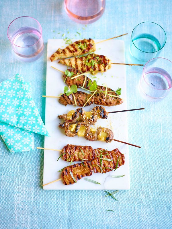 We maken de 4 verschillende marinades (surf naar de website van Delhaize voor het recept) en laten de kip-, runds-, lams- en eendenborstfilets minstens 30 minuten marineren. We rijgen ze op houten spiesjes en ze zijn klaar voor op de barbeque of de grill.