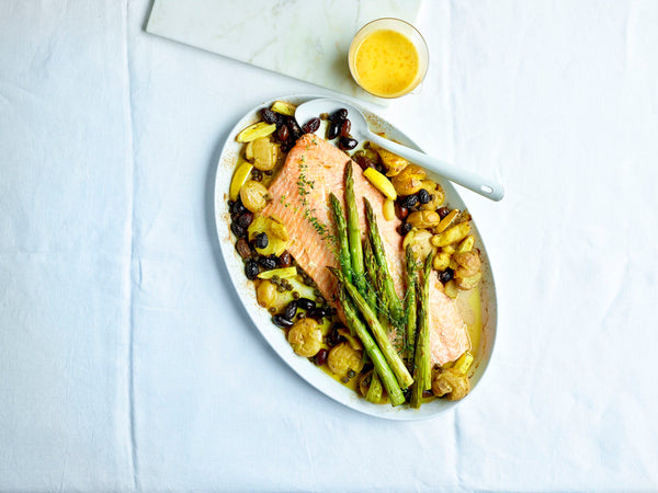 Plet de gekookte krieltjes lichtjes met een groot mes. Snijd de citroen in 8 partjes. Meng de krieltjes met de citroenpartjes, kalamata-olijven, kappertjes, 2 el olijfolie en wat peper. Leg dit mengsel rond de zalm in de ovenschaal. Schik de asperges bovenop de krieltjes en bestrooi met 4 takjes tijm.