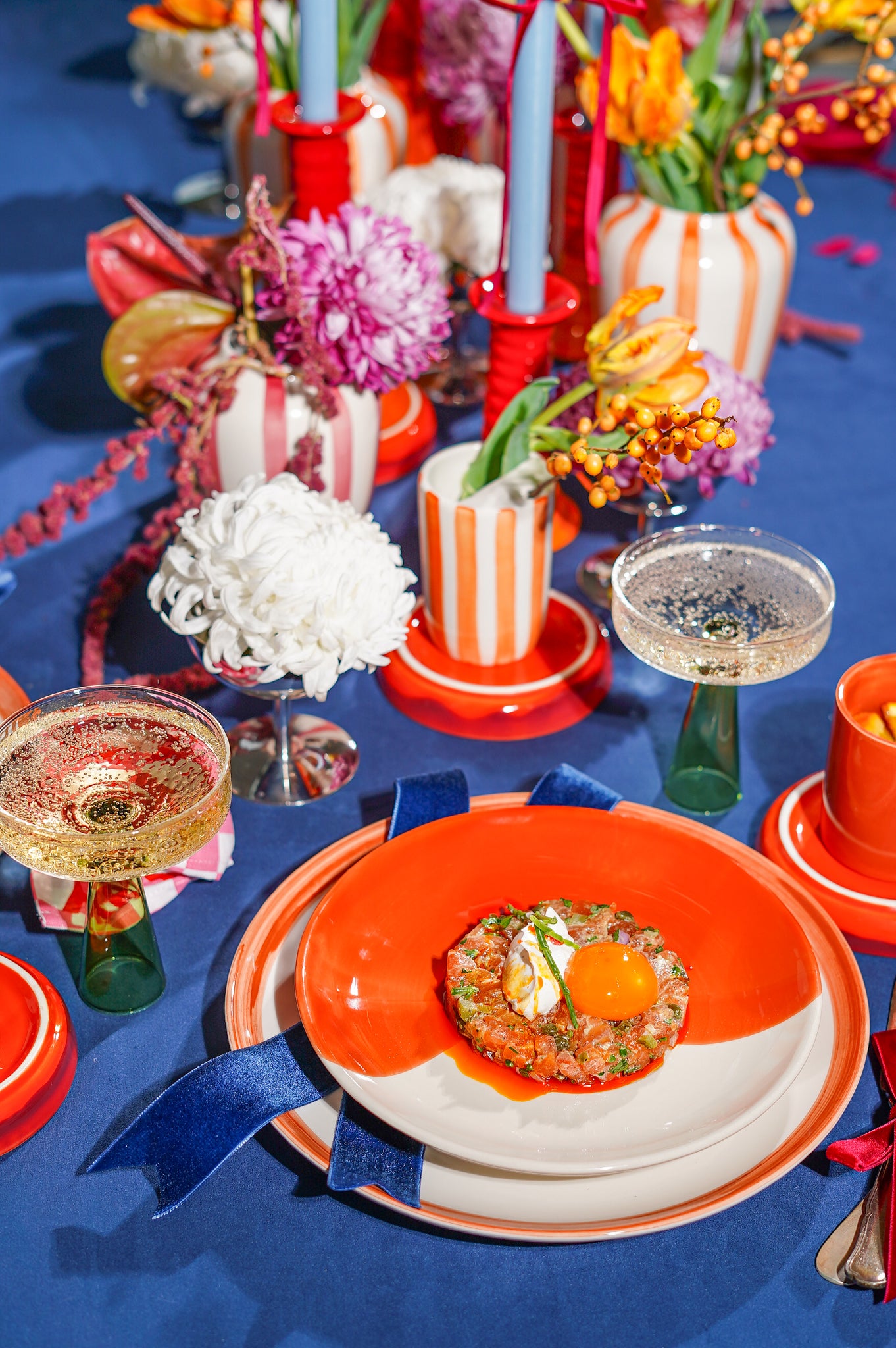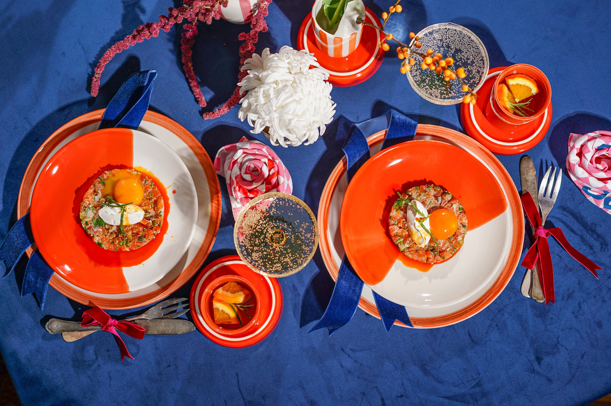 - Geconfijte dooier bovenop tartaar voor visueel & textuurlijk “wow”-effect.