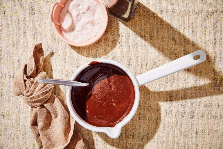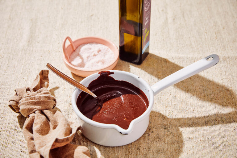 Zelfgemaakte chocoladesaus met fleur de sel en olijfolie