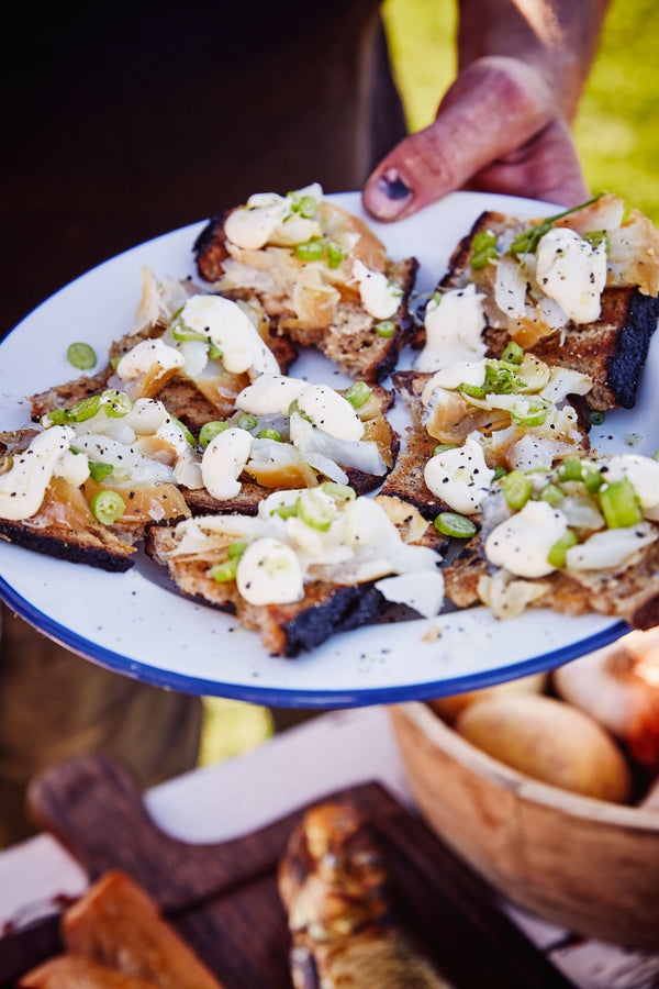 Olie van gebrande prei, zure room, zwarte peper