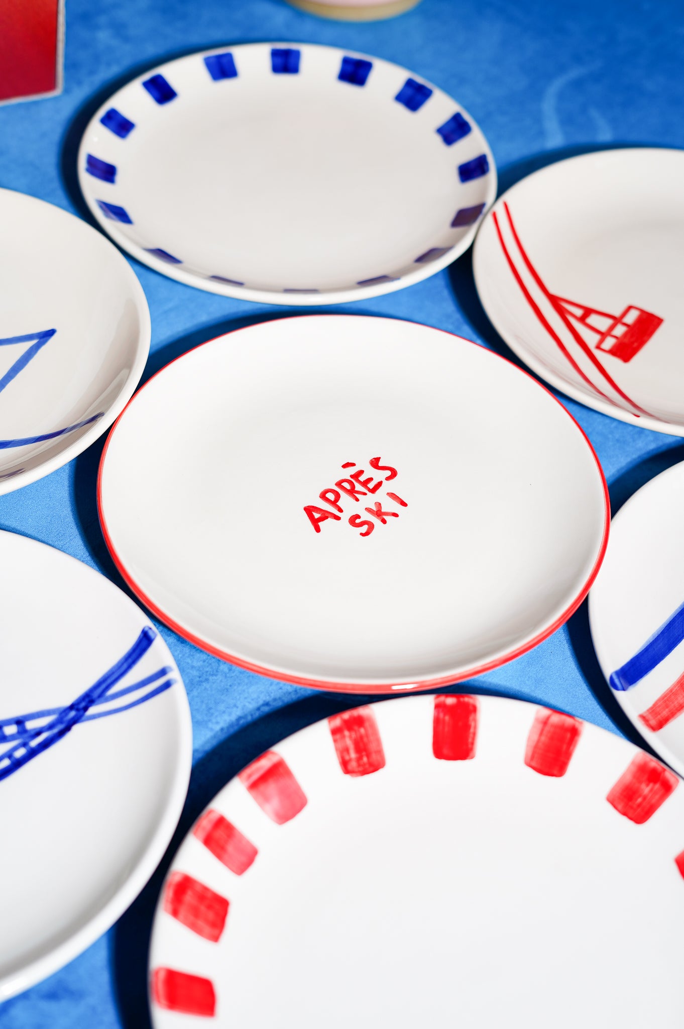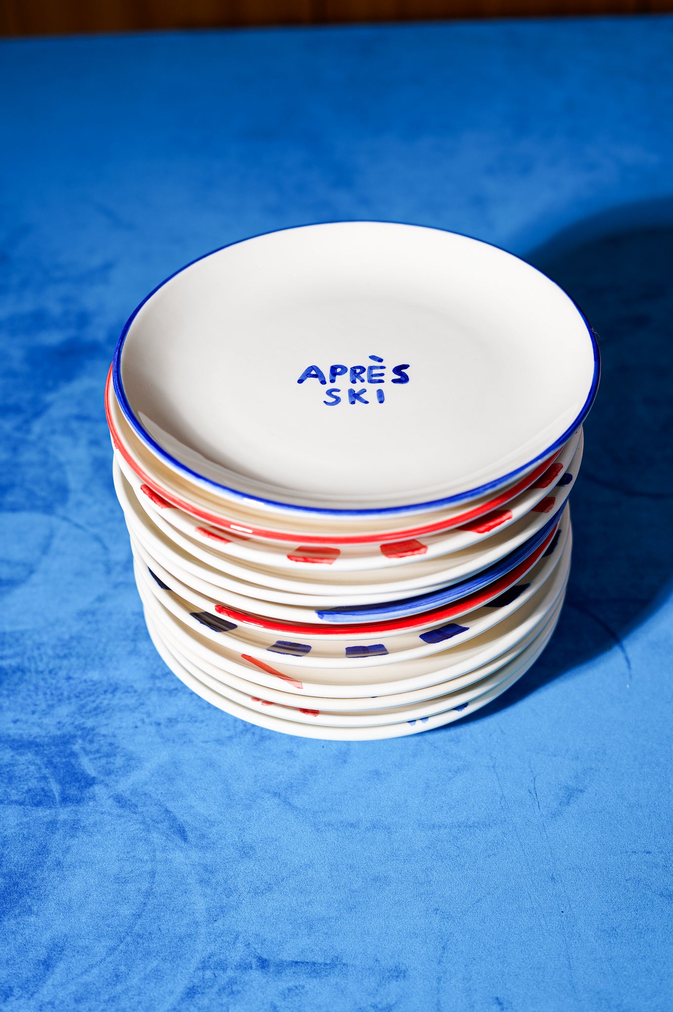 Vier reeksen, telkens 12 rood-blauwe borden die de charme van besneeuwde bergtoppen uitstralen. Perfect formaat van 22,5 cm voor ontbijt, voorgerecht of dessert — en instant gezelligheid op tafel.
