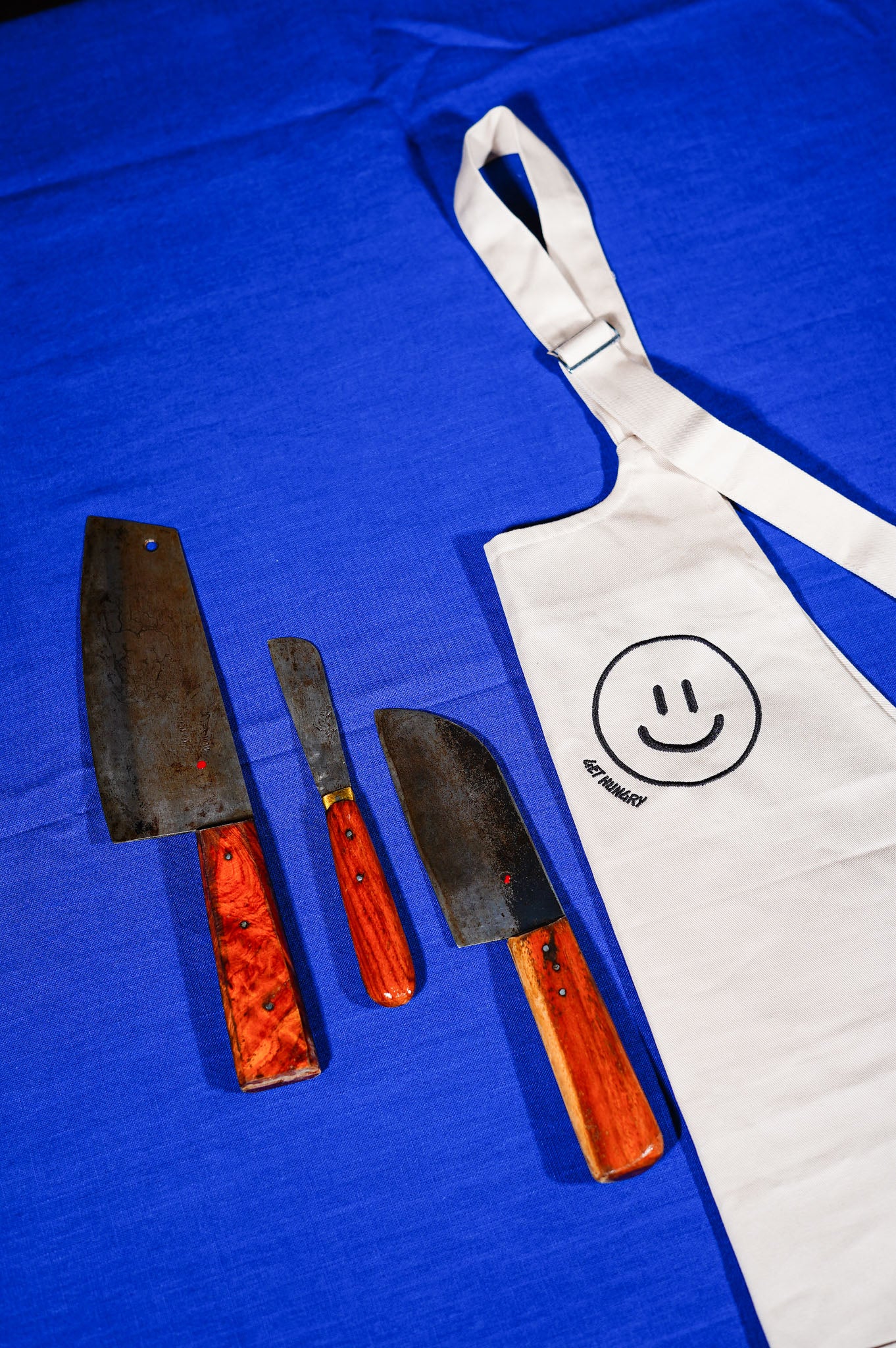 De drie handgemaakte Thaise messen zijn elk een klein meesterwerkje: compact, vlijmscherp en perfect gebalanceerd. Ideaal voor alles van fijne kruiden tot stevige groenten of een sappig stukje vlees. Elk mes wordt in Thailand met de hand gesmeed, dus geen twee zijn identiek, dat maakt ze extra bijzonder.