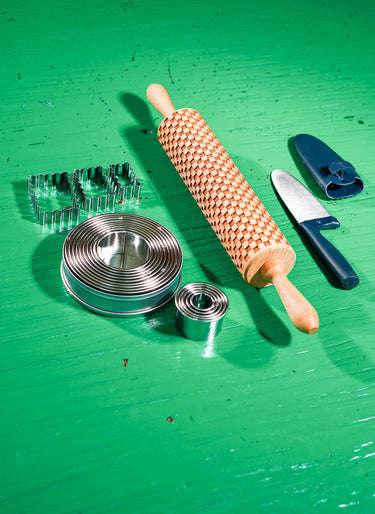 Deze set is gemaakt voor jonge bakkers die graag zelf de touwtjes in handen nemen. Met een stevige deegrol met een cool dambordpatroon, een veilig kidsmes , een set rechthoekige uitduwvormpjes in petit beurre-stijl en een ronde uitduwset in verschillende maten, kunnen ze helemaal los.