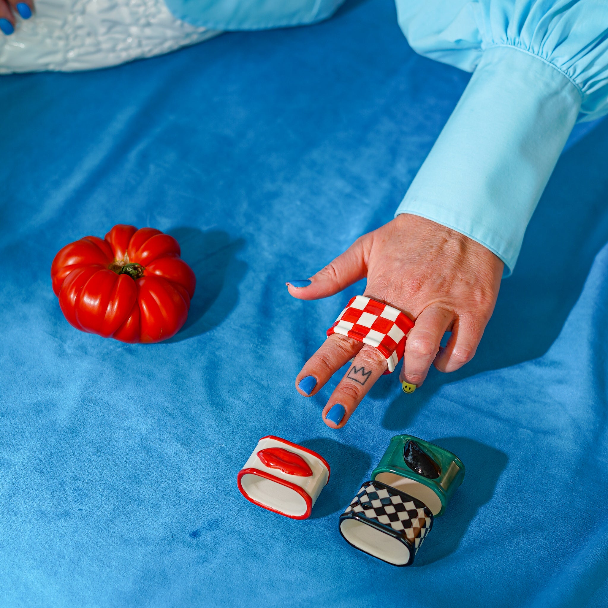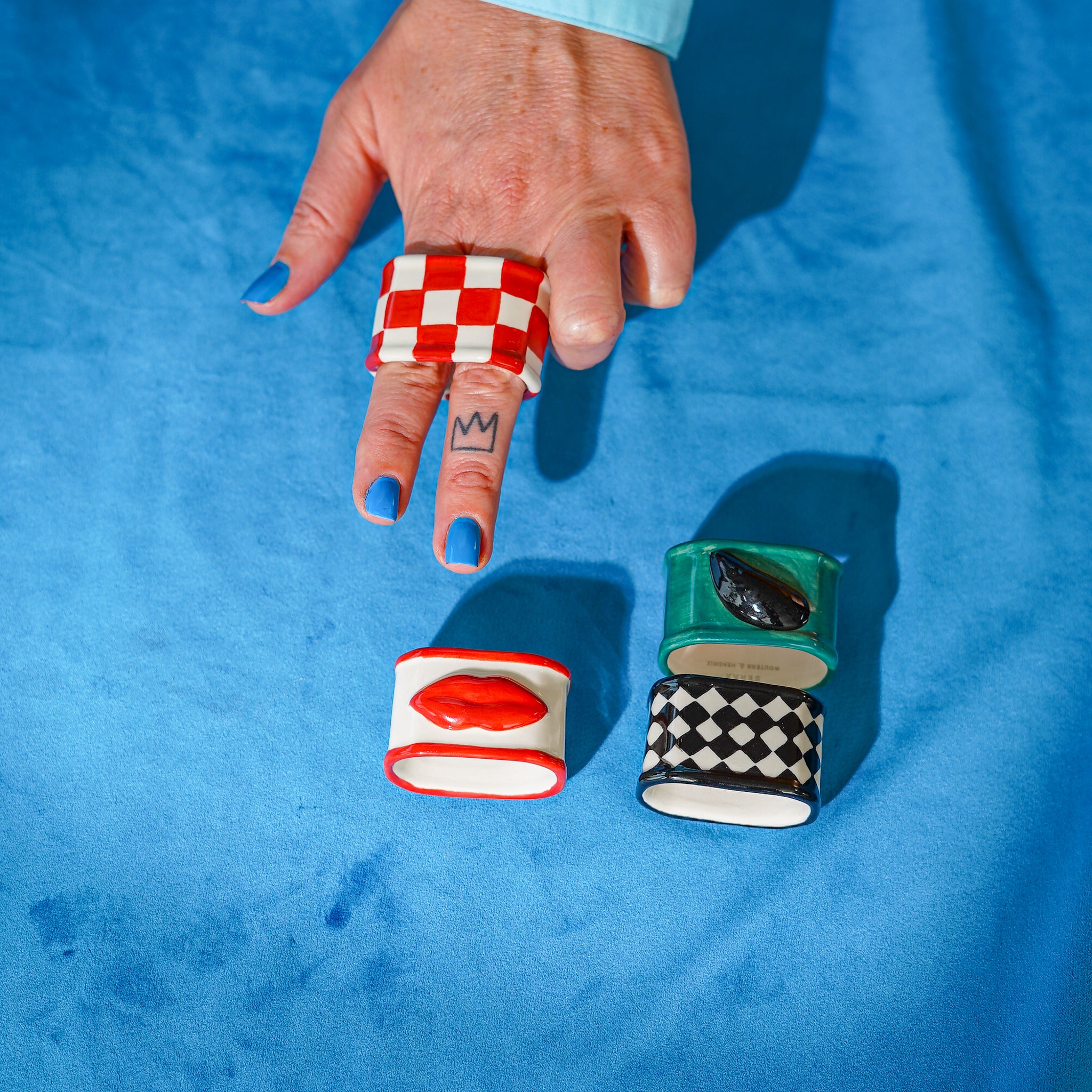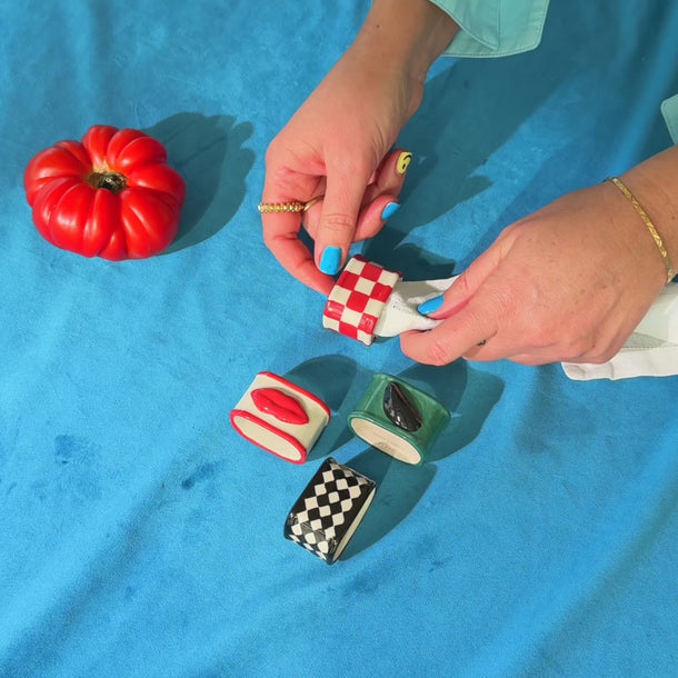 Moet je deze nu eens zien! Ik heb deze keramieken servetringen uitgekozen omdat ze zó speels en origineel zijn. Ze zijn geïnspireerd op dat surrealisme van vroeger, je weet wel, die kunst met een hoekje af, en ik vind dat echt de max. Je krijgt een hele mix: twee keer een dambordpatroon, die iconische lippen (natuurlijk!) en... een mosseltje! Als je die op tafel legt, is de sfeer direct gezet. Het bewijst maar weer dat die kleine details het verschil maken tussen een gewone tafel en een tafel met die echte wauw-factor. Het is chic, het is fun, en het is gewoon zó leuk om naar te kijken. Ik ben fan!
