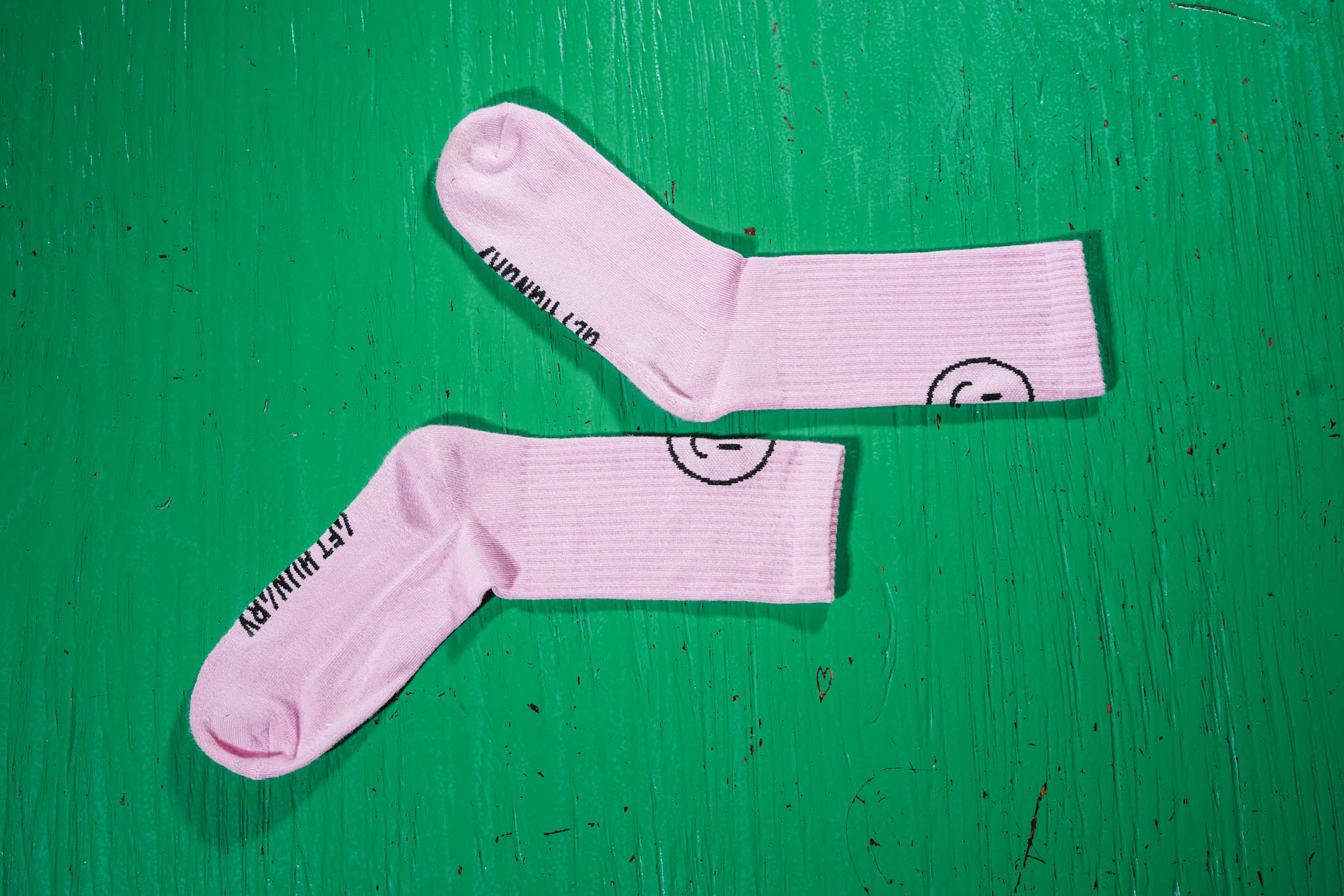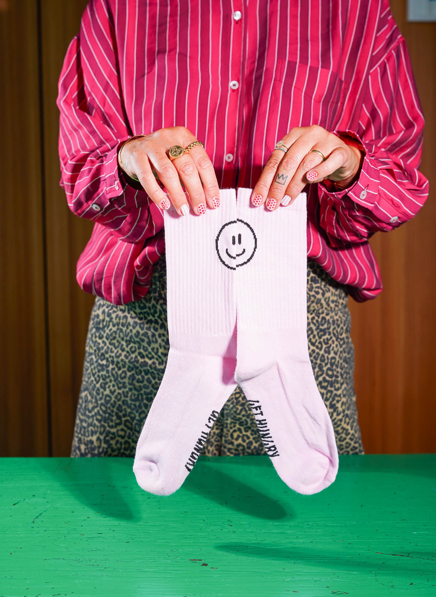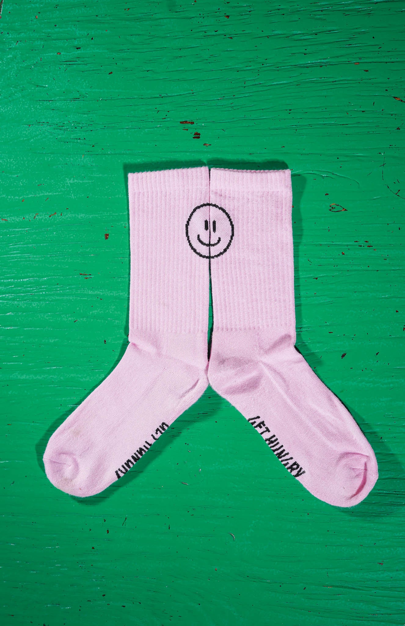 Ontdek onze signature sportsokken. Achteraan zie je een vrolijke smiley, en op de voetzool “Get Hungry”.