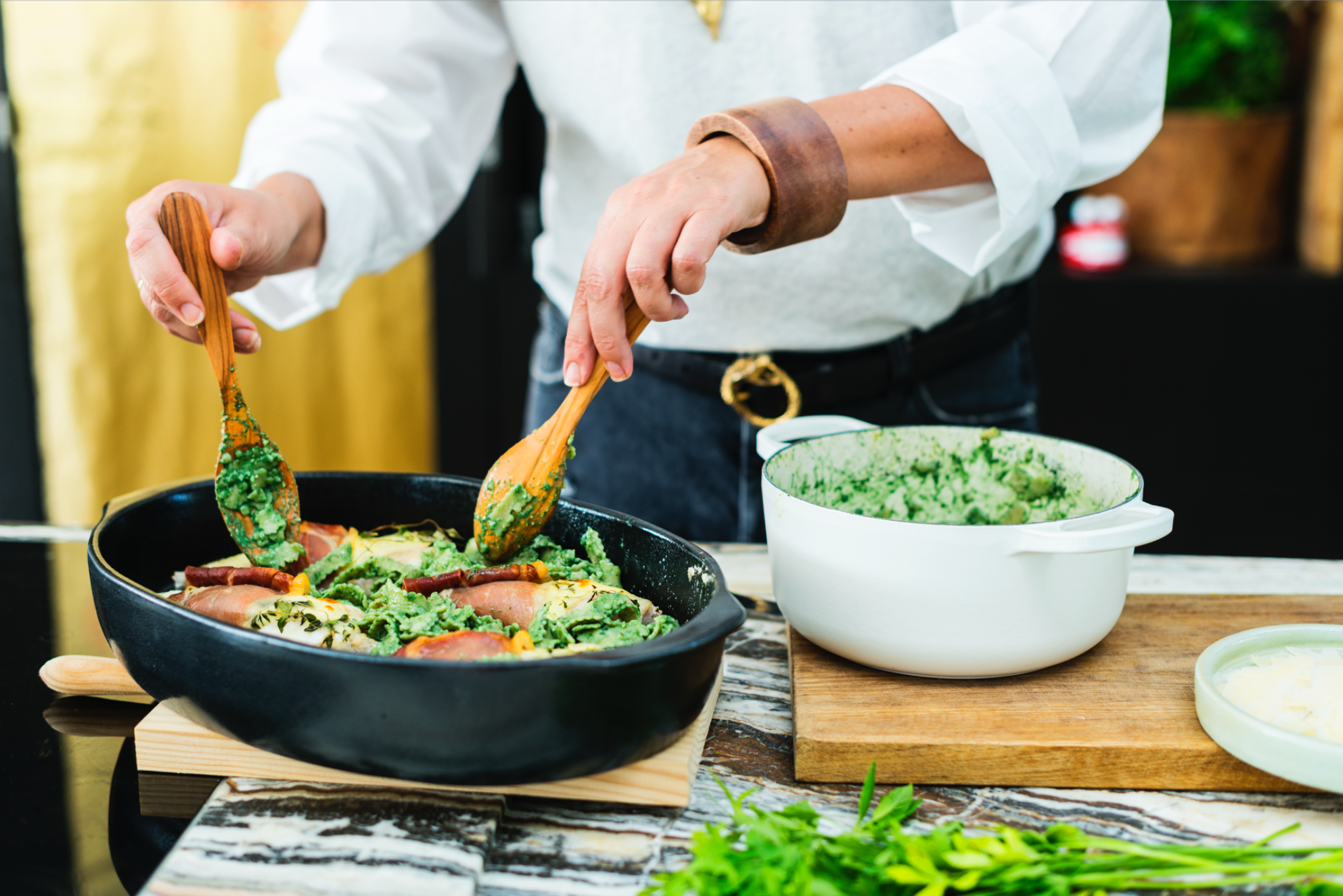 Ovenschotel met cordon bleu van zeeduivel, volkoren pasta en pesto