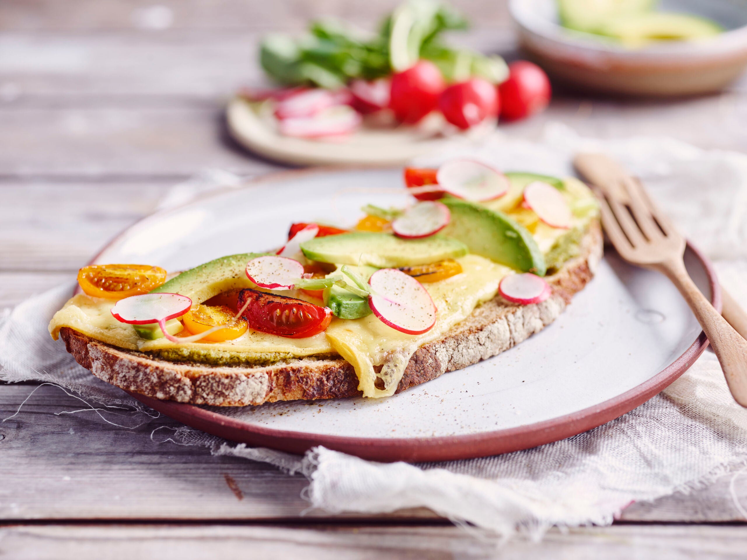 Toast met pesto van groene olijven, jonge kaas en salade van avocado en radijs