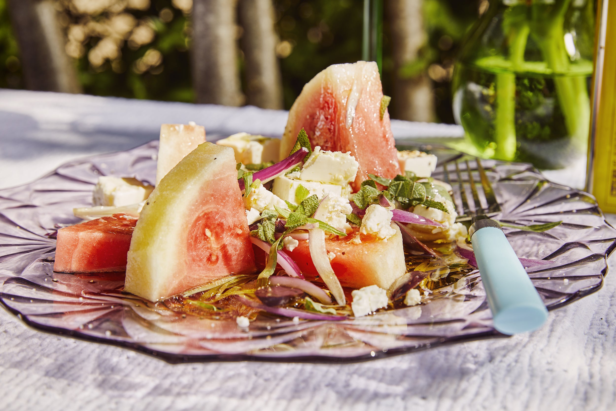 Watermeloen salade met feta en olijven